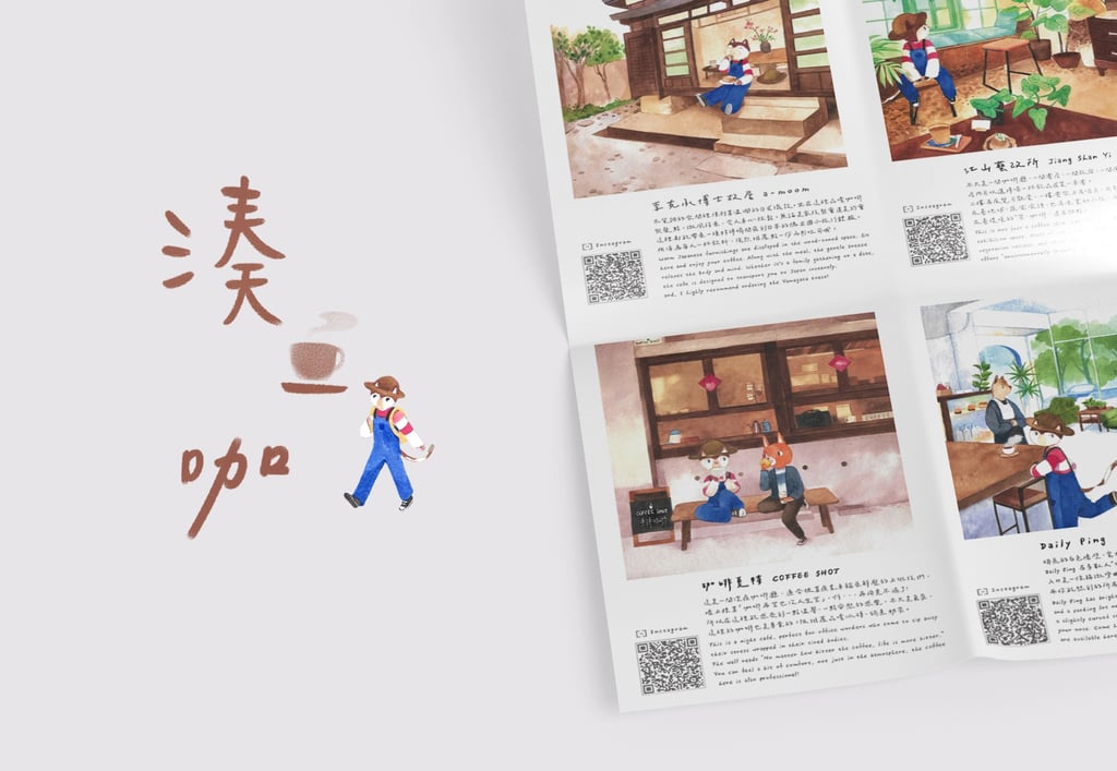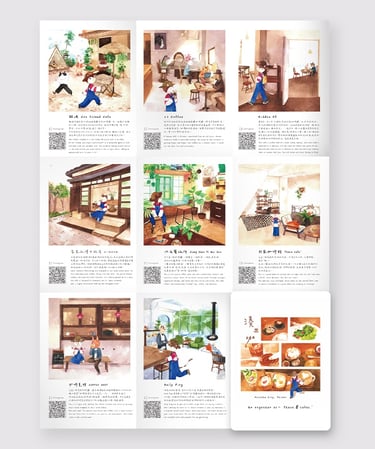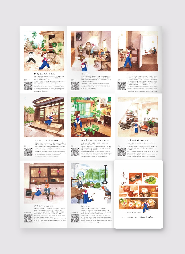 Open it to look at the cafe's illustrations and the introduction. I also added QR codes for each cafe's info to make it easy to find each cafe.